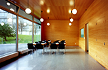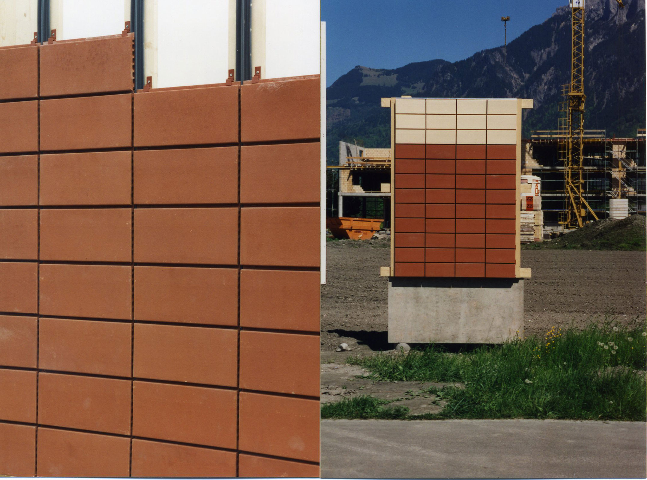 Eine gut sichtbare, eineinhalb geschossige Eingangspartie und eine ruhige Fassade mit wenigen großen Öffnungen bestimmen den Charakter des Gebäudes.