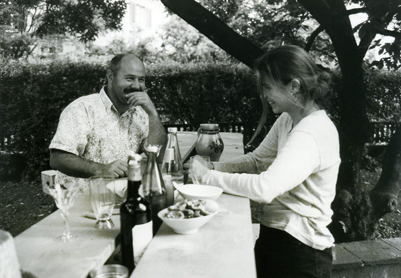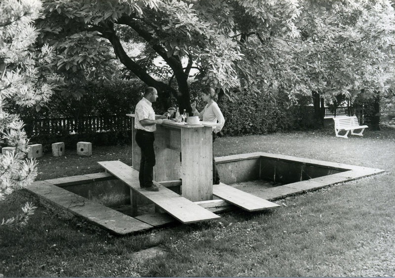 Unter dem Magnolienbaum im Garten vor dem Büro spannt sich die Bar über den Teich aus Melser Schiefer.