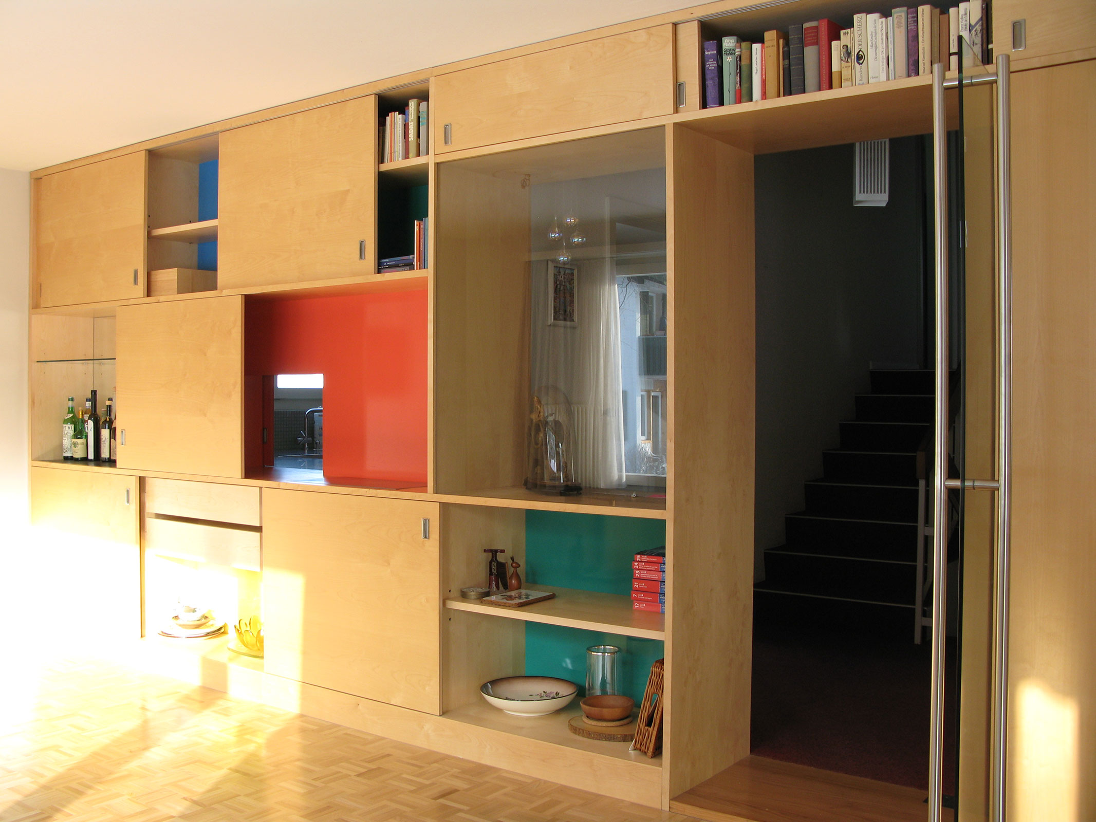 Ein Wohnzimmermöbel fasst Durchgänge zum Kaminzimmer und ins Treppenhaus, die Durchreiche in die Küche sowie Stauraum für Bücher und Geschirr in einem Element zusammen. Das Möbel aus Birkenholz nimmt die Grundrissdisposition der Cheminee-Wand auf und setzt deren Raumhaltigkeit fort. Es wird zum verschliessbaren Durchgang, zur Kommode für das Telefon und zum Buffet (Sideboard), beinhaltet eine Hausbar, eine Wärmeplatte und einen Lautsprecher.