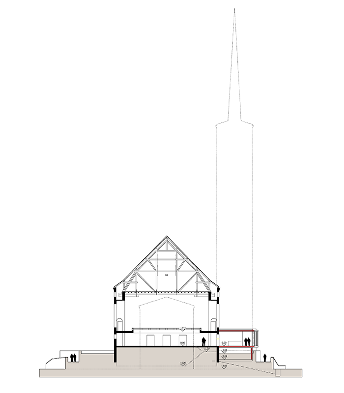 Der Entwurf stellt den Versuch dar der Kirche eine seitliche Erweiterung anzufügen ohne die Ausgewogenheit des Bauwerks zu zerstören oder dessen Gestalt zu verstellen. Der Anbau hebt sich farblich vom Kirchenkörper ab und verbindet sich mit der Sockelmauer des Turmes. Der Baukörper ist zwischen die Stützmauer und die mächtige Ostfassade der Kirche gesetzt und erstreckt sich über die ganze Länge des Kirchenraumes. Dadurch wird er zu einem Teil der Kirche und kann morphologisch als Seitenschiff gelesen werden. Die Terrassenmauer bleibt intakt und sichtbar. Der Erweiterungsbau wahrt die Fernwirkung der Kirche ebenso wie deren Integrität.