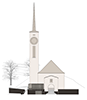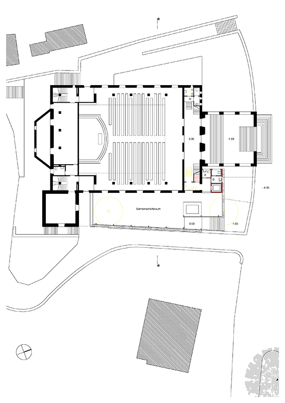 Der Gemeinschaftsraum ist als heller, sich gegen Außen öffnender Raum gedacht. Fünf Durchgänge anstelle der bestehenden Fenster verbinden den Begegnungsraum mit dem introvertierten, der geistigen Konzentration dienenden Kirchenraum. Der Hauptzugang erfolgt vom Kirchenfoyer aus. Der neue Raum ist großzügig verglast. Die Offenheit und der Lichteinfall können aber durch Lamellen aus Kupfer dosiert werden.
