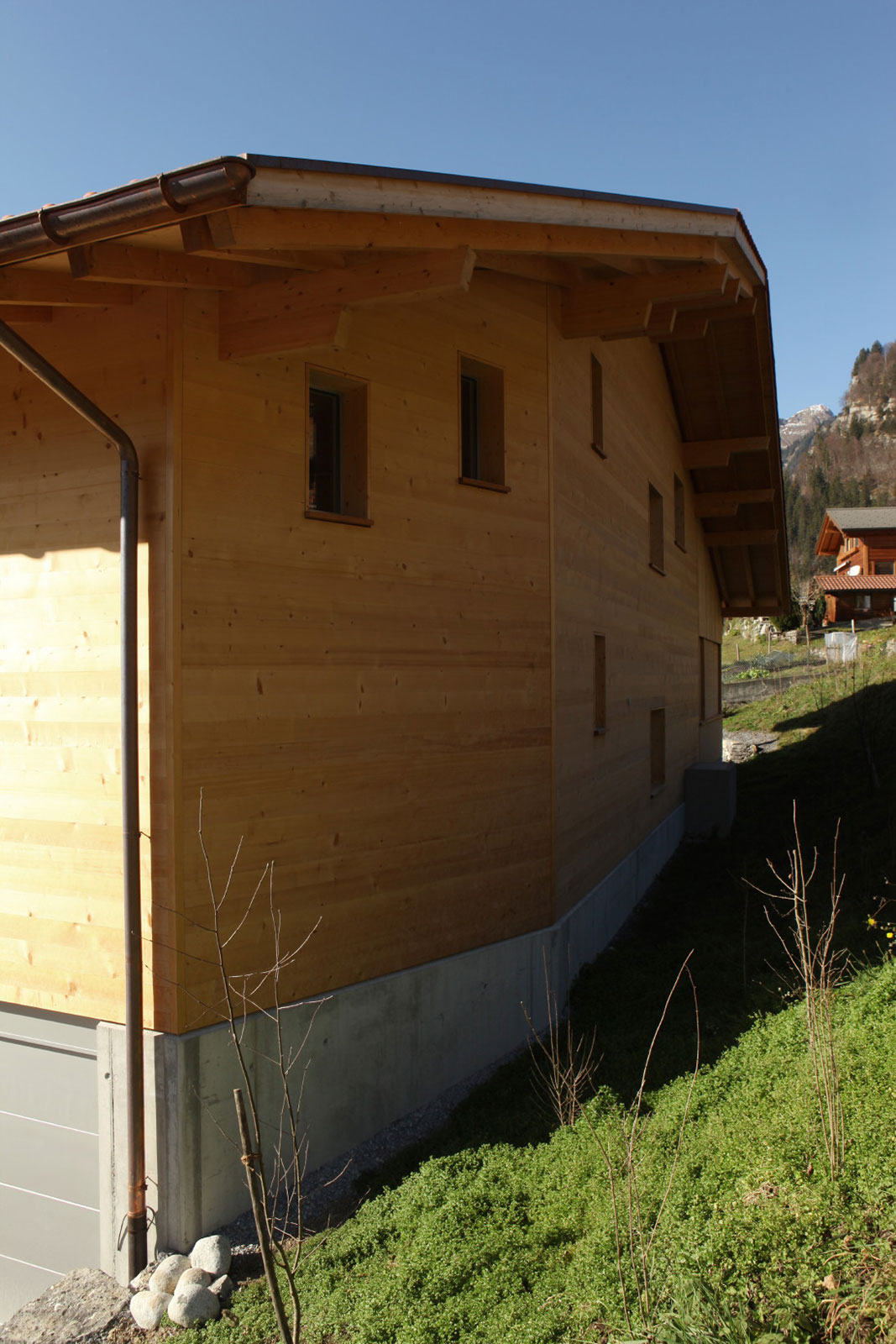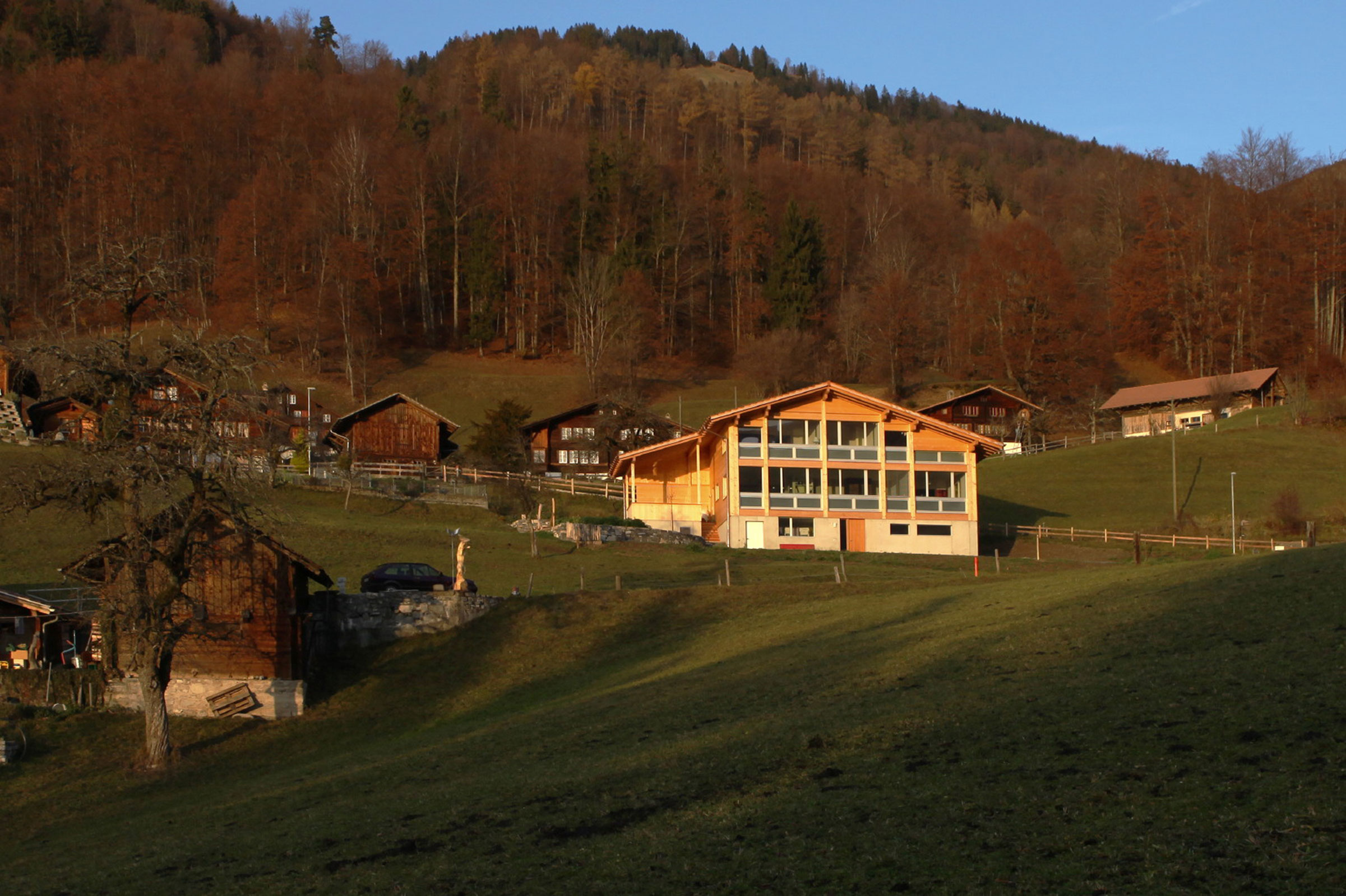 Über dem Brienzer See zwischen Rothorn und Ballenberg liegt die Häusergruppe von Oberschwanden auf einem sonnigen, von den tiefen Einschnitten zweier Bäche begrenzten Geländerücken. Die urchigen Berner Oberländer Bauernhäuer, die sonnige Lage und der bedrohliche Lammbachgraben haben den Entwurf des Hauses wesentlich beeinflusst.